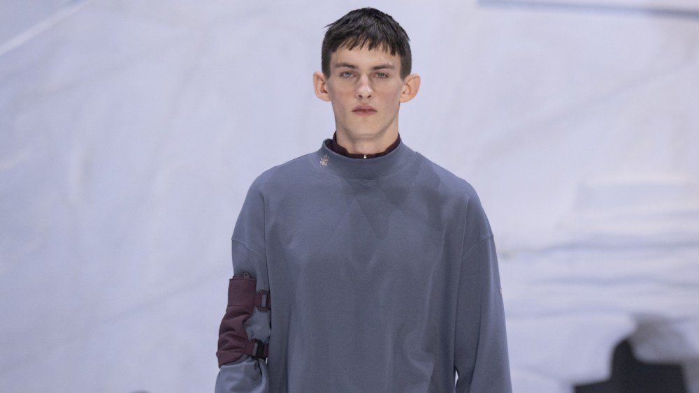 The co-ed collection opened on gorpcore galore, filtered through a urban and utilitarian lens. For women, nylon pleated skirts featuring fastening straps worn with base layers, while leotards mingled with padded miniskirts and windbreakers. Duster coats with matching pants layered over rain jackets and relaxed suits for men, or overshirts with matching pants, lent a techy, nerdy look.
