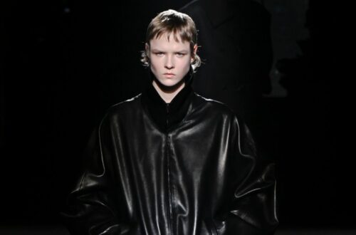 Leaf motifs were embedded into the denim surface, hinting at the designer’s ongoing experimentation with treated fabrics.