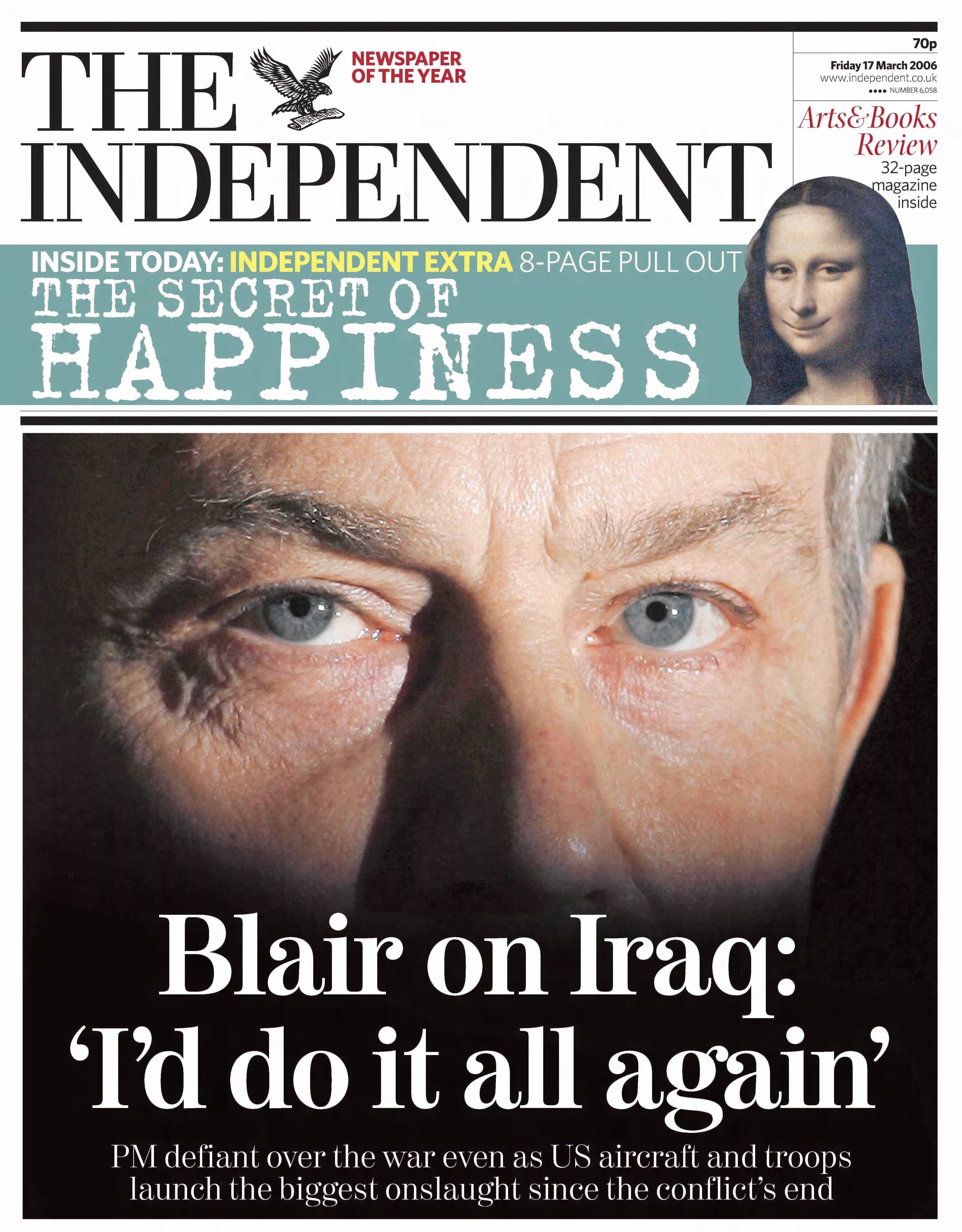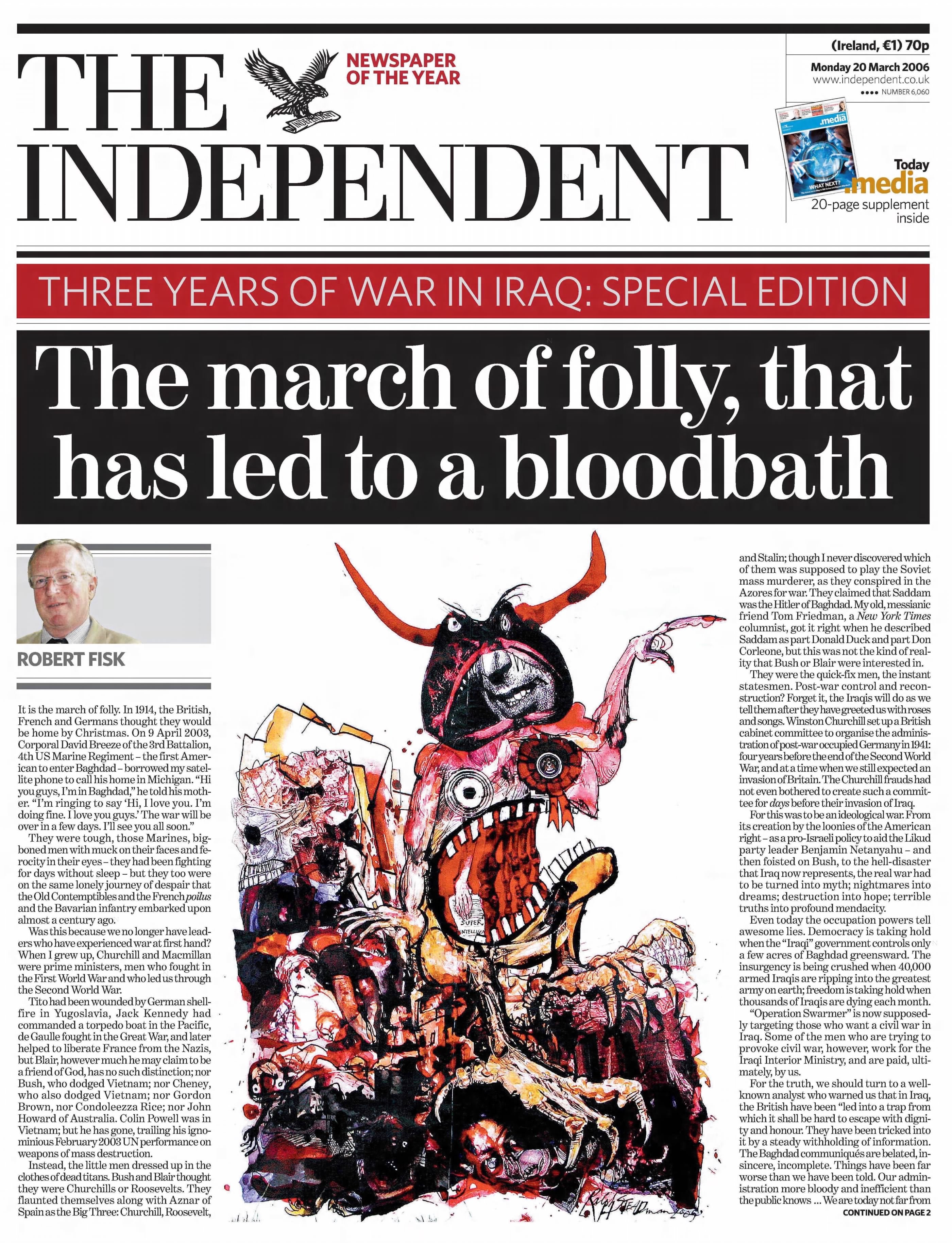 In a special three-year retrospective on the Iraq war, The Independent runs a distinctive front-page illustration by Ralph Steadman, well known for his work on Fear and Loathing in Las Vegas. Foreign reporter Robert Fisk labels the conflict a “march of folly”. Condemning the invasion’s ideological origins, Fisk writes, “from its creation by the loonies of the American right – as a pro-Israeli policy to aid the Likud party leader Benjamin Netanyahu – and then foisted on Bush, to the hell disaster that Iraq now represents, the real war had to be turned into myth”.
