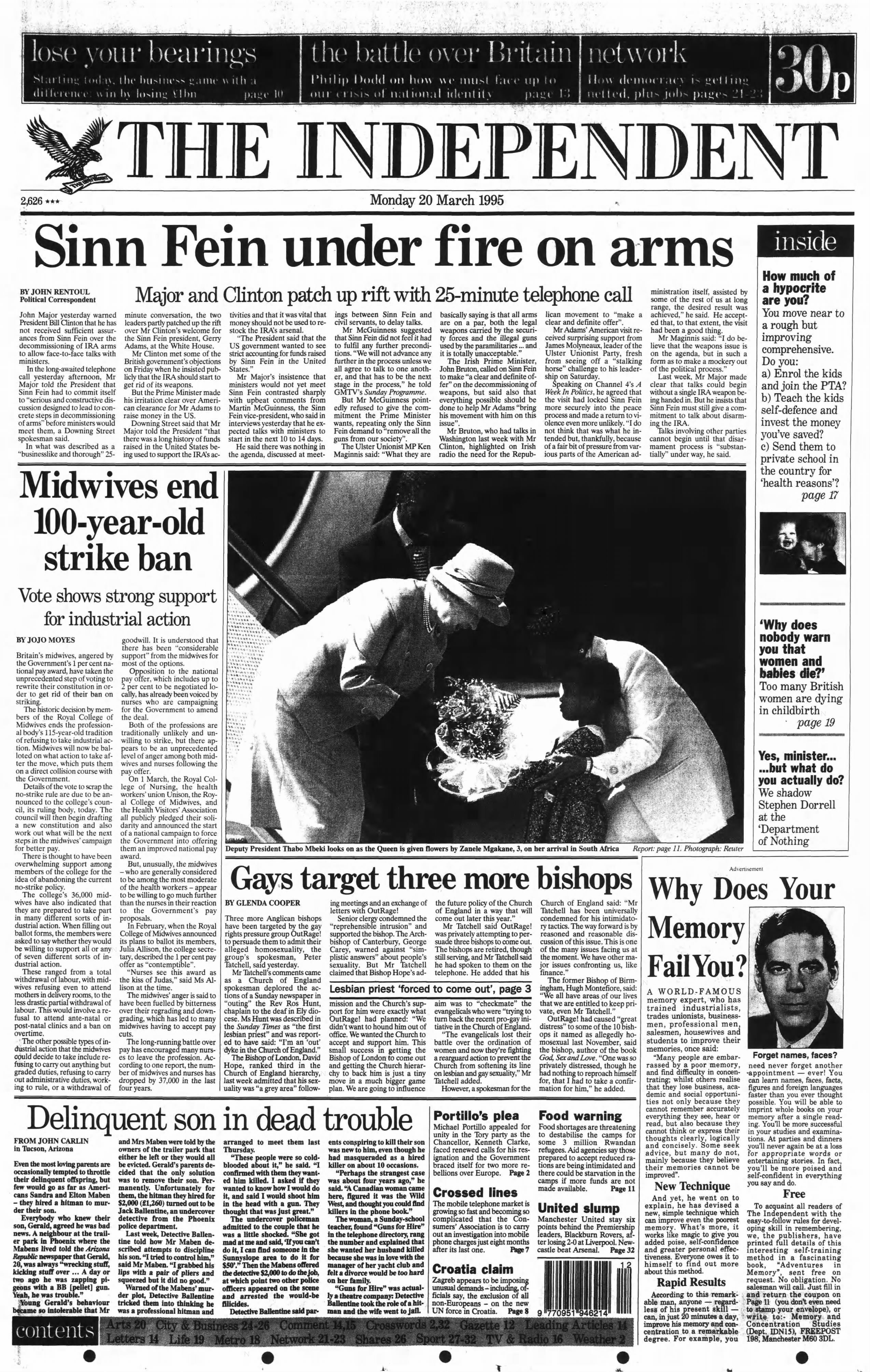 Pressure mounts on Sinn Fein to clarify its position on the decommissioning of IRA weapons. British prime minister John Major warns US president Bill Clinton that talks with Sinn Fein cannot proceed without firm assurances that IRA arms will be put beyond use. The dispute highlights the fragile state of the Northern Ireland peace process in the early months of the IRA ceasefire, as negotiations inch toward what will eventually become the Good Friday Agreement.