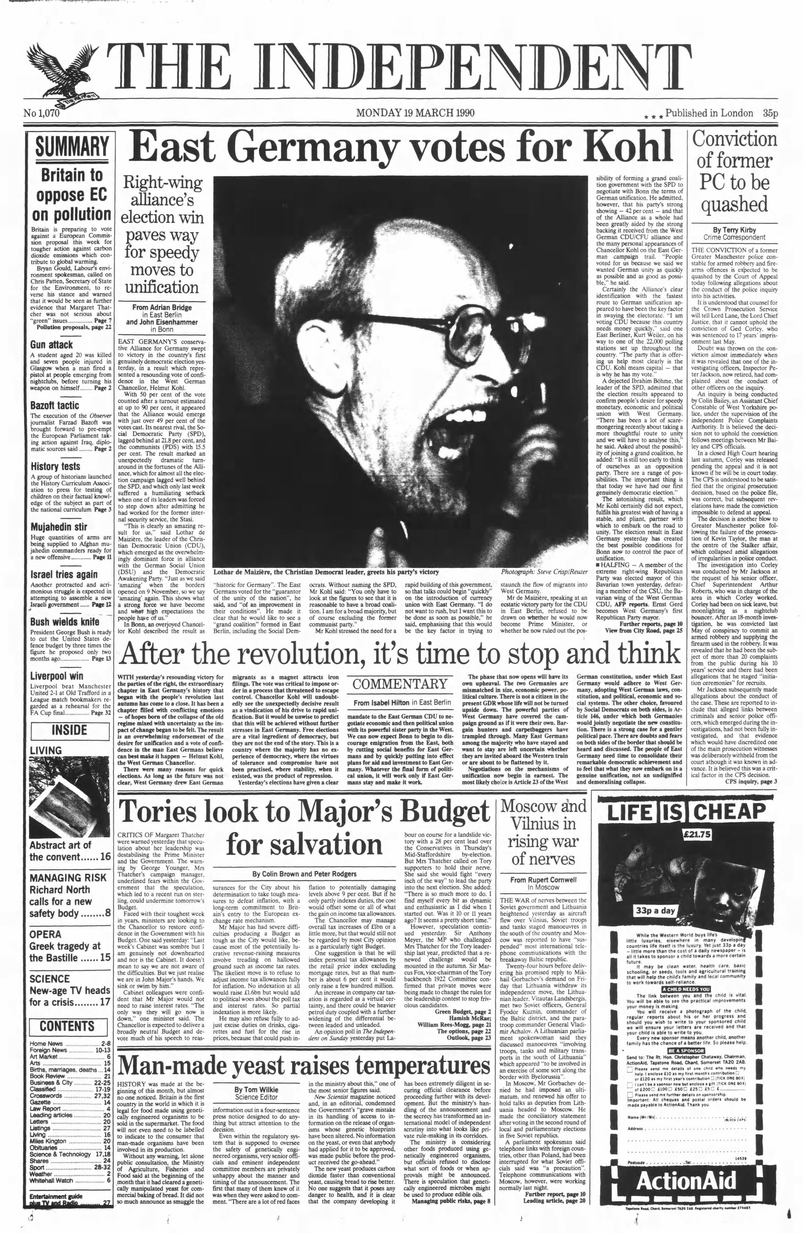 East Germans deliver a decisive victory for the conservative Alliance for Germany in the country’s first free elections, backing a platform that promises rapid reunification with the West. The result strengthens the hand of Helmut Kohl and his government in Bonn, paving the way for negotiations that lead to the formal reunification of Germany later that year.