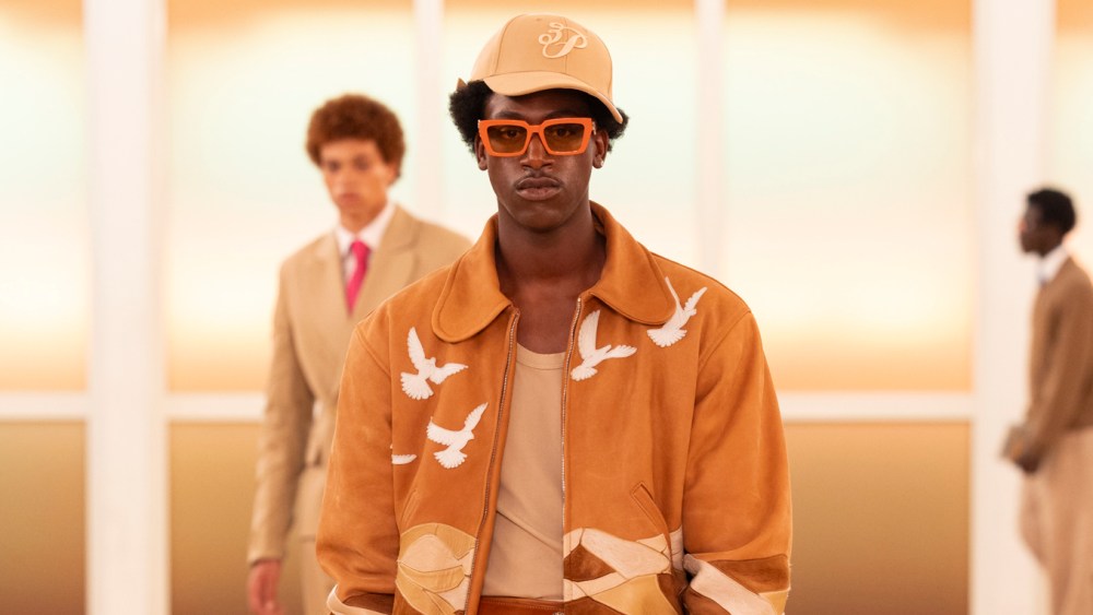 The opening look, a bomber in a patchwork of suedes in sandy hues, featured the brand’s bird motifs and the message “We are all travelers,” reprised through the collection on fun book clutches or woven leather shoppers. A graphic print of vintage watches featured on shirts and denim, and a heavy coat was embroidered with real-life timepieces. The more elaborate styles were contrasted with bright sporty tone-on-tone silhouettes with trompe l’oeil details and a series of airbrushed designs evoking the setting sun.