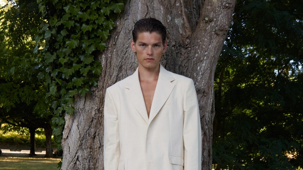 The designer continues to lean into a silky and lustrous regenerated polyester from Italian fabric house Olmetex for double-breasted jackets, trousers and zippered bomber jackets, this season offered in unusual colors like plum and café au lait.