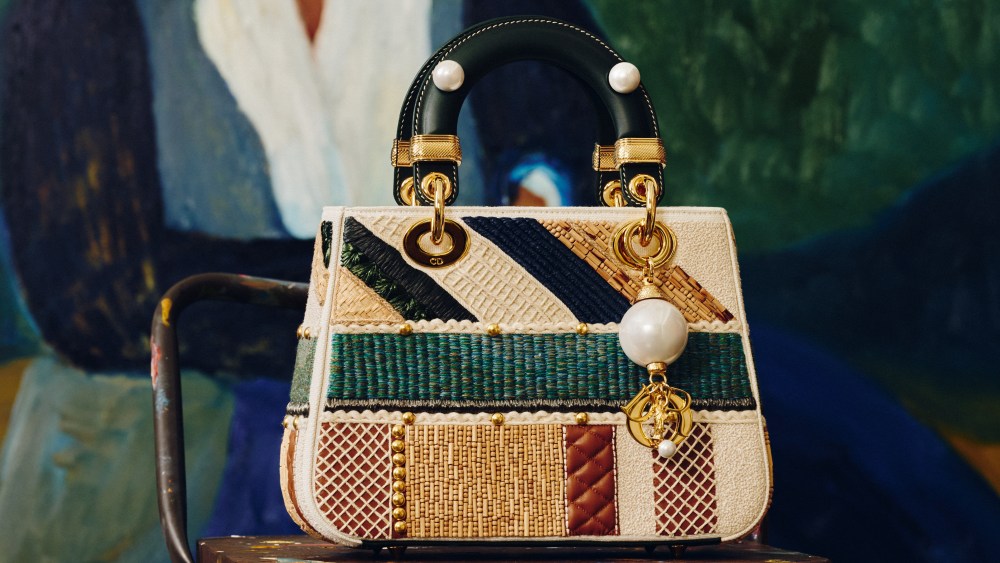 He approached his three reinterpretations of the Lady Dior as if they were accessories that might be carried by the subjects of his portraits. His leather and textile patchworks incorporate elements like wooden beads, macramé, raffia embroidery and straw weaving.