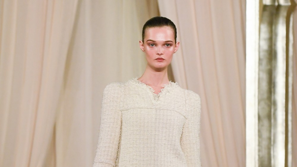 It’s been a while since the brand had this much fun with texture, from the hulking feathered shoulders on a nubby ivory tweed cape, to the ragged fringe edging tweed tunics or a fluffy black big bird coat — a mix of tweed, feathers and chiffon — tossed over a slinky ivory evening gown.