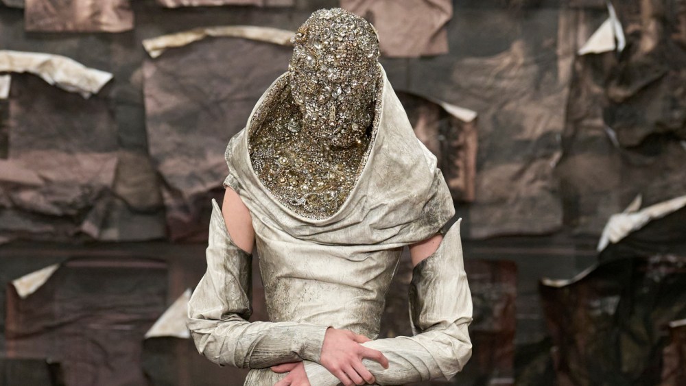 One dress in mother-of-pearl duchess satin recalled the eerie statue on the cover of the 1987 Dead Can Dance album “Within the Realm of a Dying Sun,” the head of the wearer draped in mourning. Others employing even more voluminous draping in metallic duchess were simply otherworldly — or you might say very Cardi B, who has been out-couture-ing everyone in Paris this week.