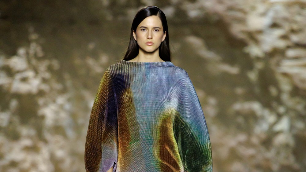 The collection drew inspiration from ’70s couture and the expressive geometry of modern art, channeling both eras through the lens of classic Saudi silhouettes. Deep burgundy bishts — the traditional flowing outer cloaks of the Arabian Peninsula — moved down the runway with architectural volume alongside fluid jersey separates in sculptural black. There were also farwas, a traditional Bedouin overcoat, and caftans, all reinterpreted through contemporary proportions, textures, and layering techniques.