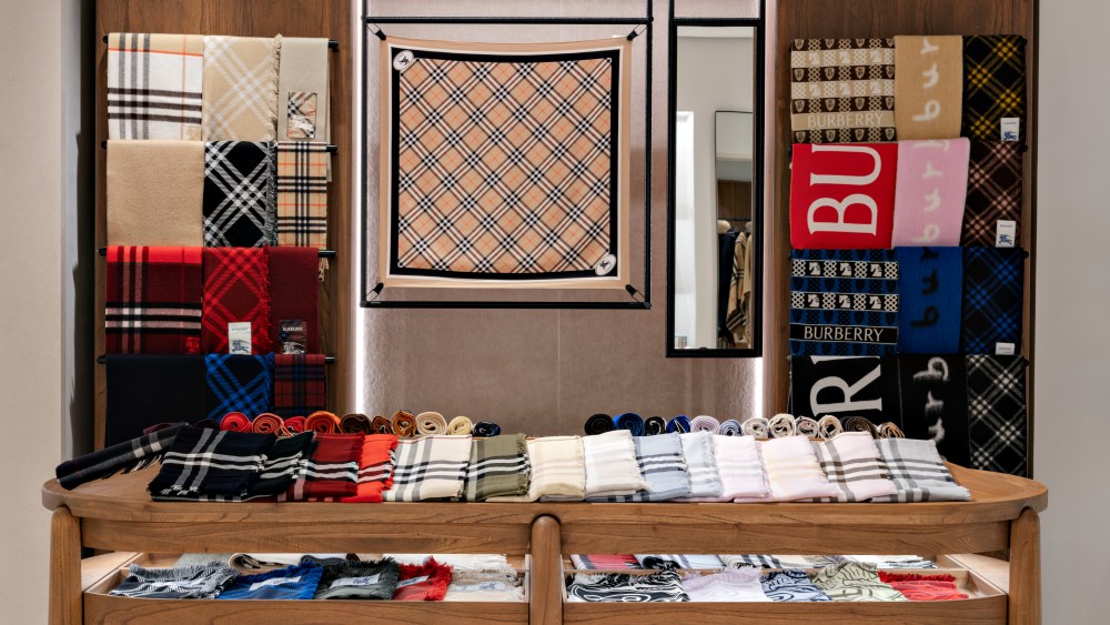 The store houses a Scarf Bar offering designs in cashmere and silk twill in a variety of colors, patterns, textures and more than 30 shades of Burberry check.